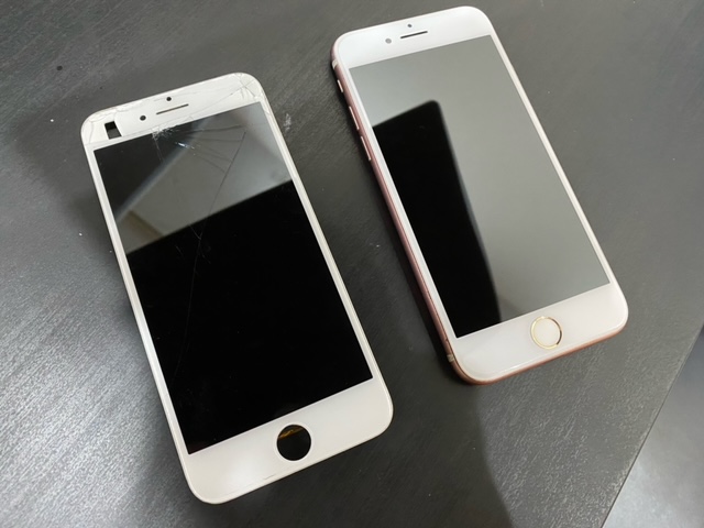 左側が割れたパネルで、耳にあてる付近が割れてしまっていて中が見えている状態です。